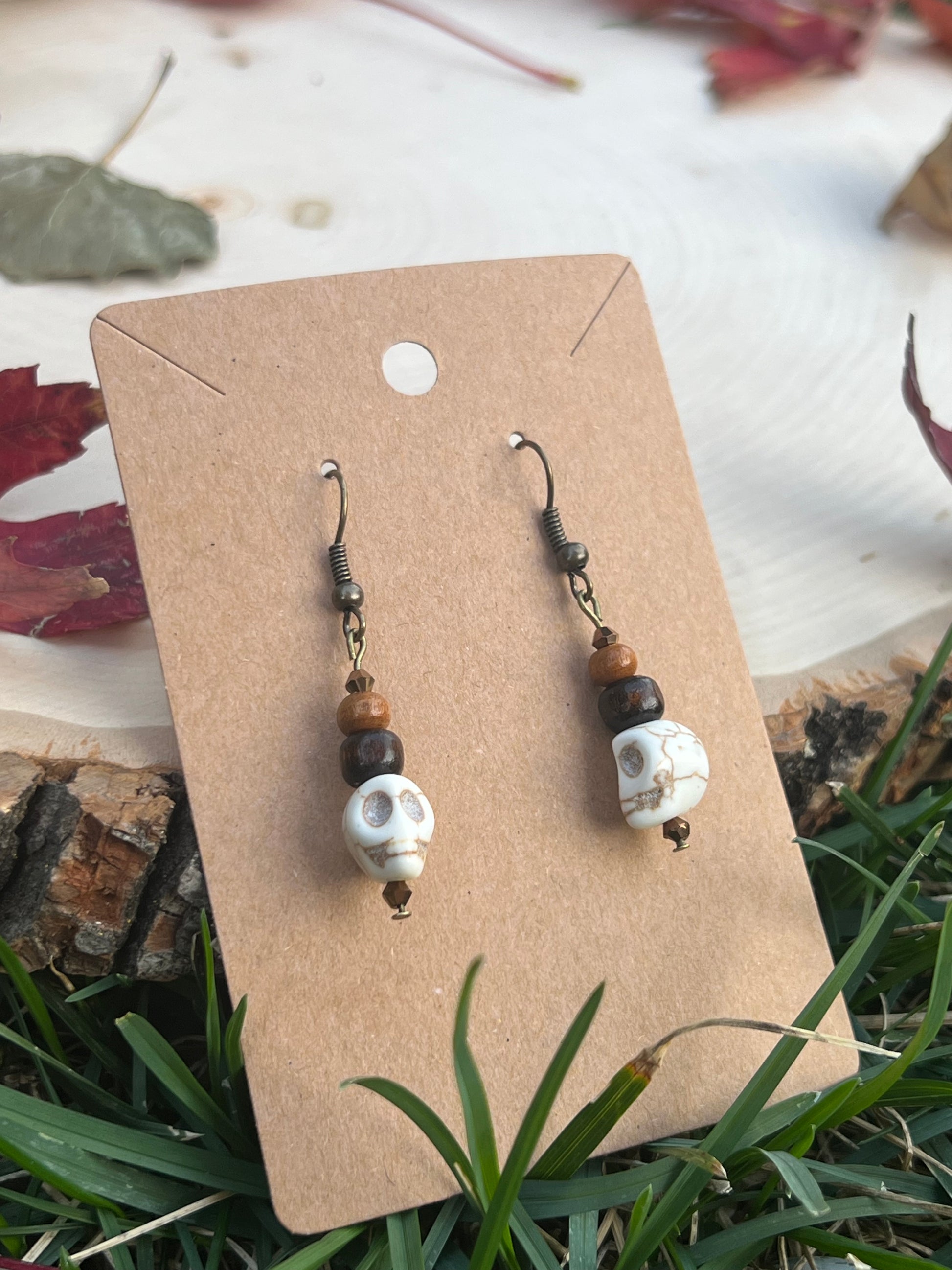 Stylish earrings featuring brown wood beads and white skull designs. Perfect for adding a unique touch to any outfit.