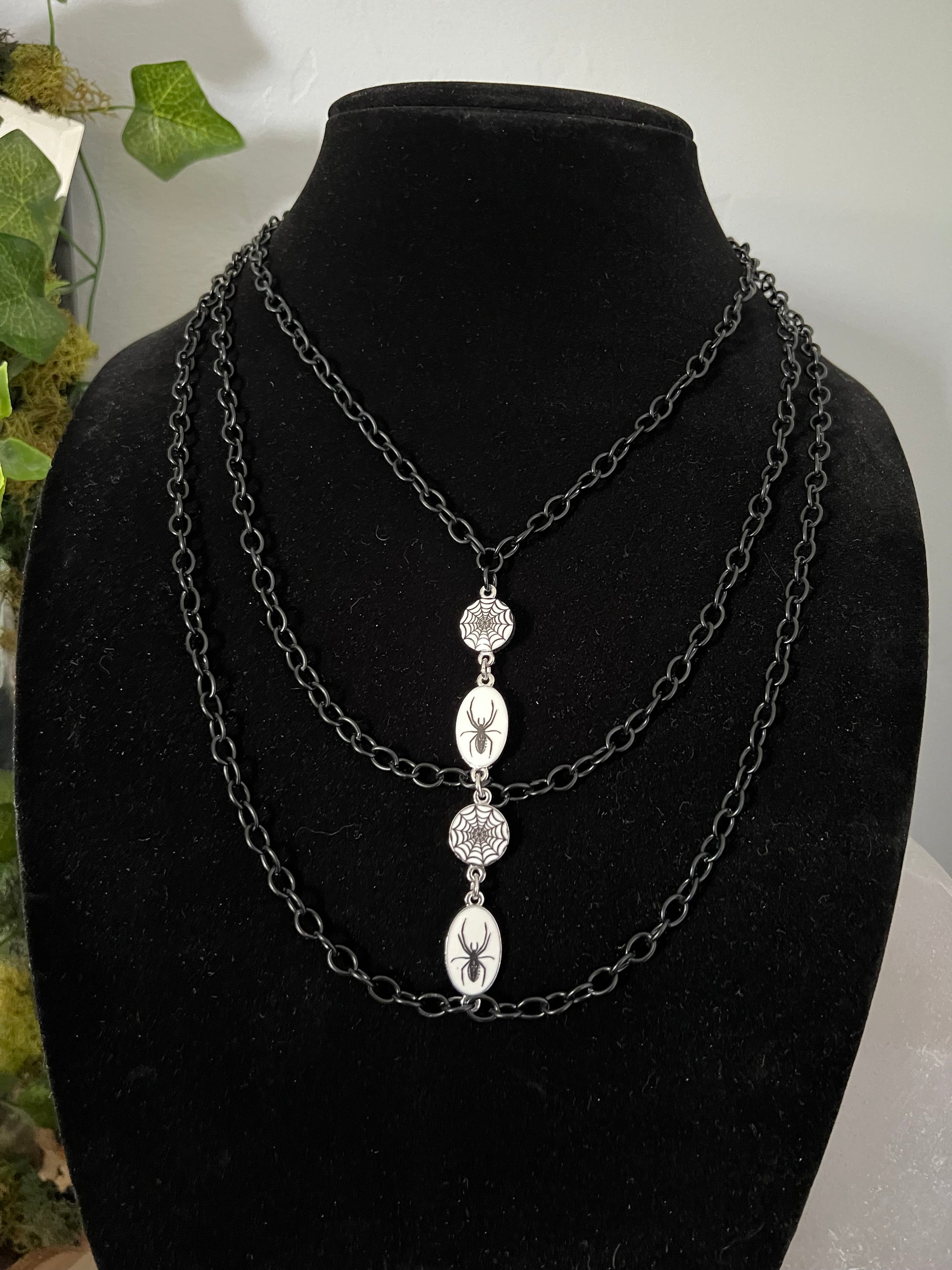 Add a touch of quirky charm to your style with our Spider and Web Necklace. This unique three-layered black chain necklace features spider and web pendants, making it the perfect accessory for anyone who loves to stand out. Get ready to spin a web of compliments with this playful piece!